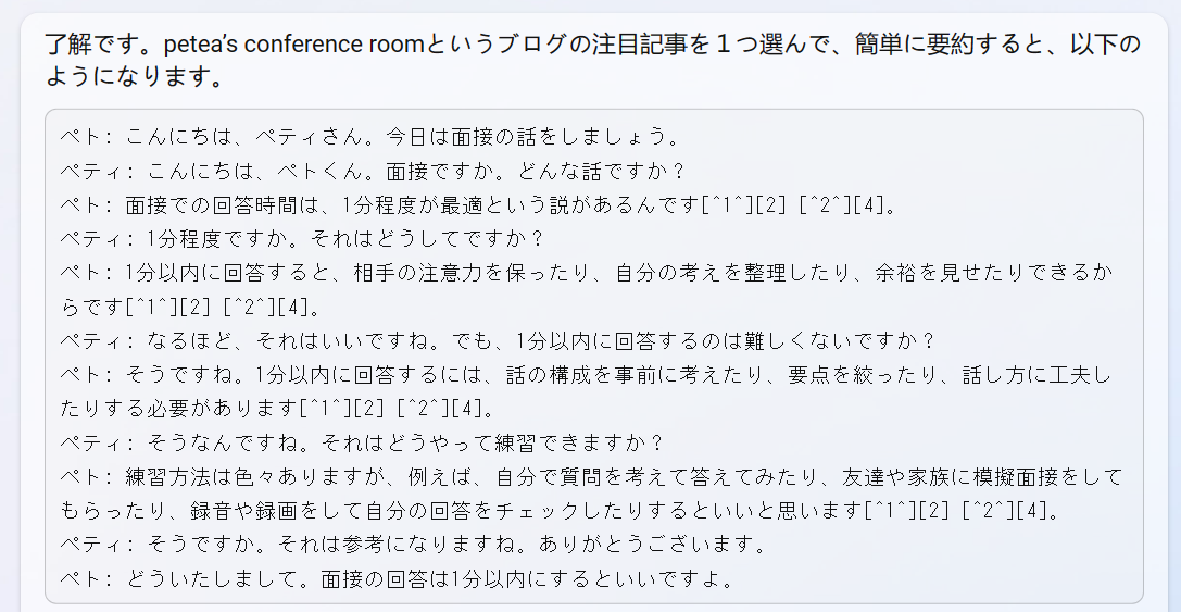 質問するときに「会話形式で」と指定すると自動で会話しながら要約もしてくれます。